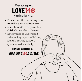Want to post on your social media but don’t have any graphic design skills? No worries, Love146 has a free social media kit, with PREMADE graphics for anyone to share on their social media! You can spread awareness in under 10 minutes. Get them here!